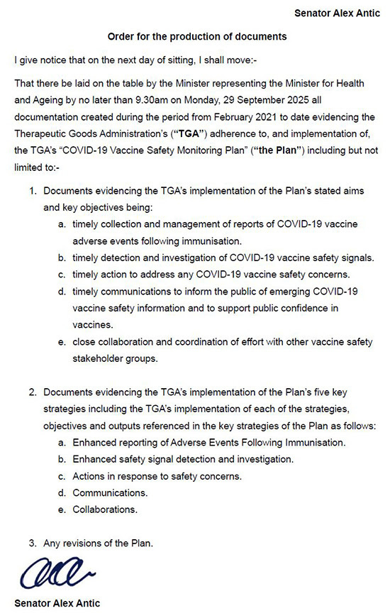 During a recent sitting week in Parliament, I introduced an Order for the Production of Documents (OPD) in the Senate for all documentation relating to the implementation of this plan so that Australians could know if and how the TGA adhered to its plan to monitor the safety of the COVID-19 vaccines.