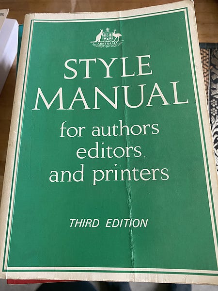 I spent a few hours there (but could have easily spent all day), and happened to pick up a book titled “STYLE MANUAL for authors, editors and printers (of Australian government Publications) ” (third edition). * First published in 1966 © Commonwealth of Australia 1978.